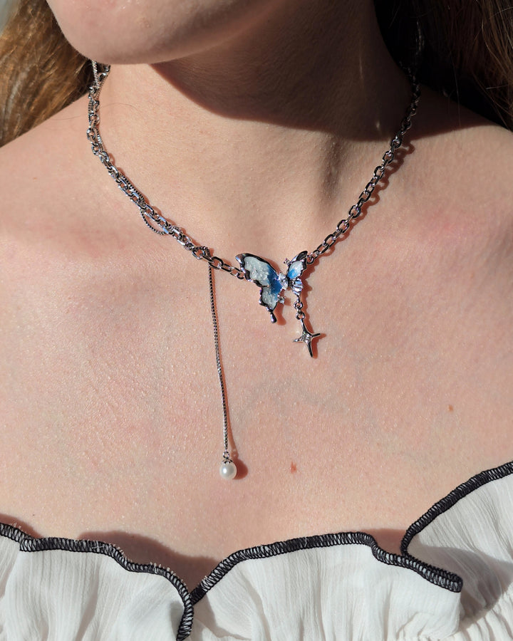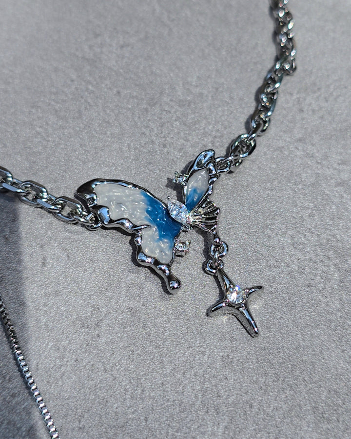 Silver chain necklace featurig a butterfly pendant with glacier-toned wings, adorned with zirconia and a star charm.