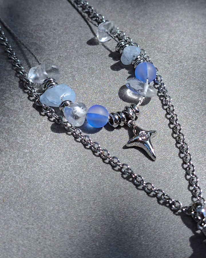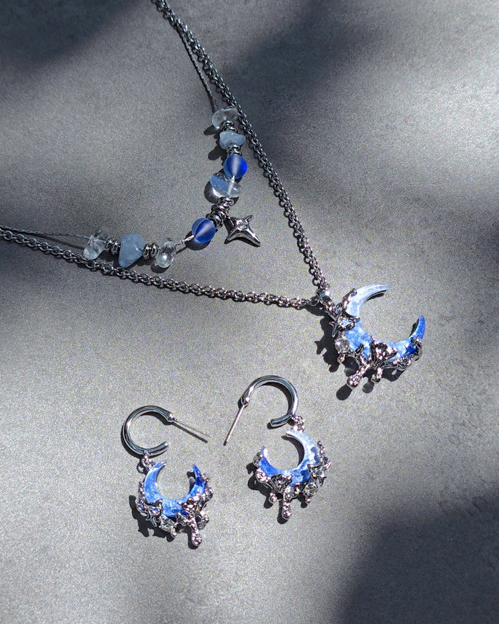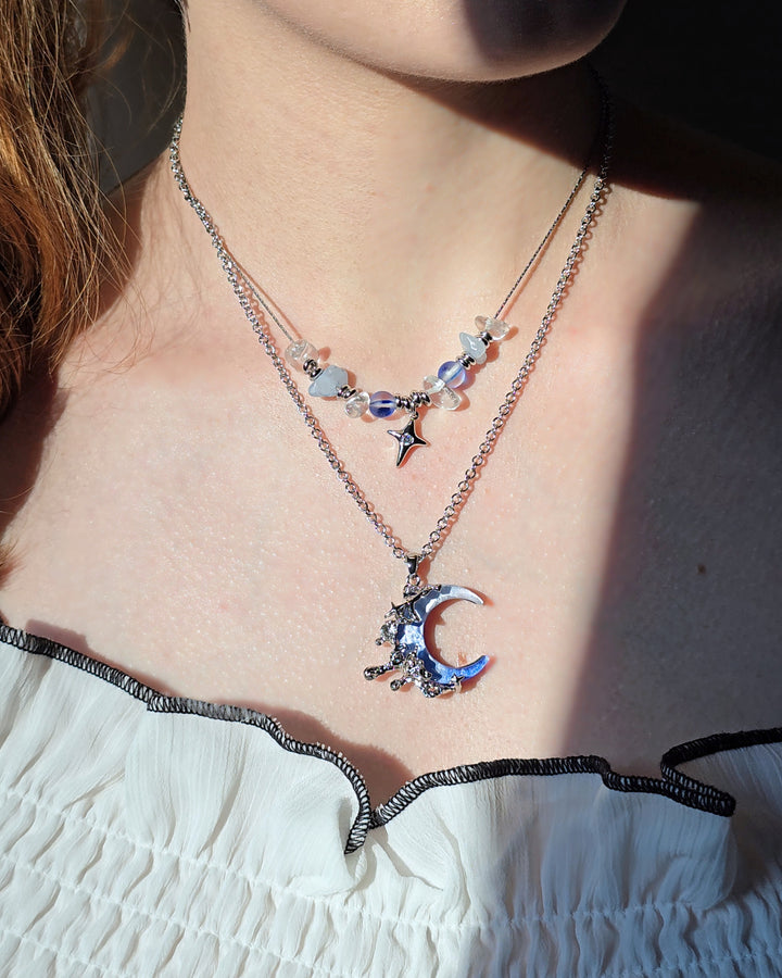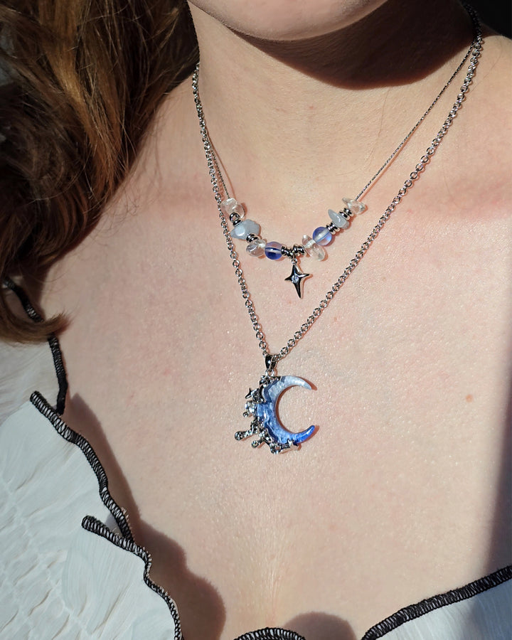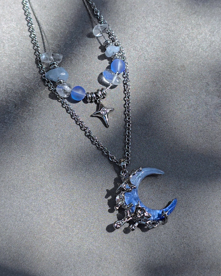 Layered silver necklace featuring a shimmering blue crescent moon pendant with sparkling crystal details for celestial touch. The beaded strand with soft blue and clear stones is finished with a delicate star charm.
