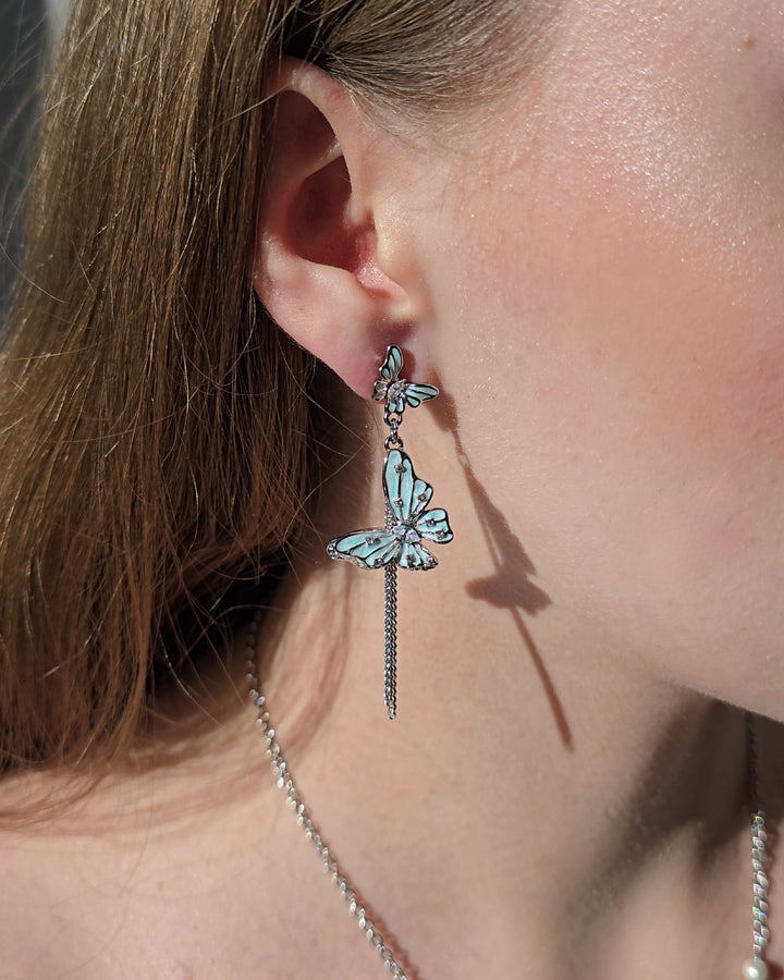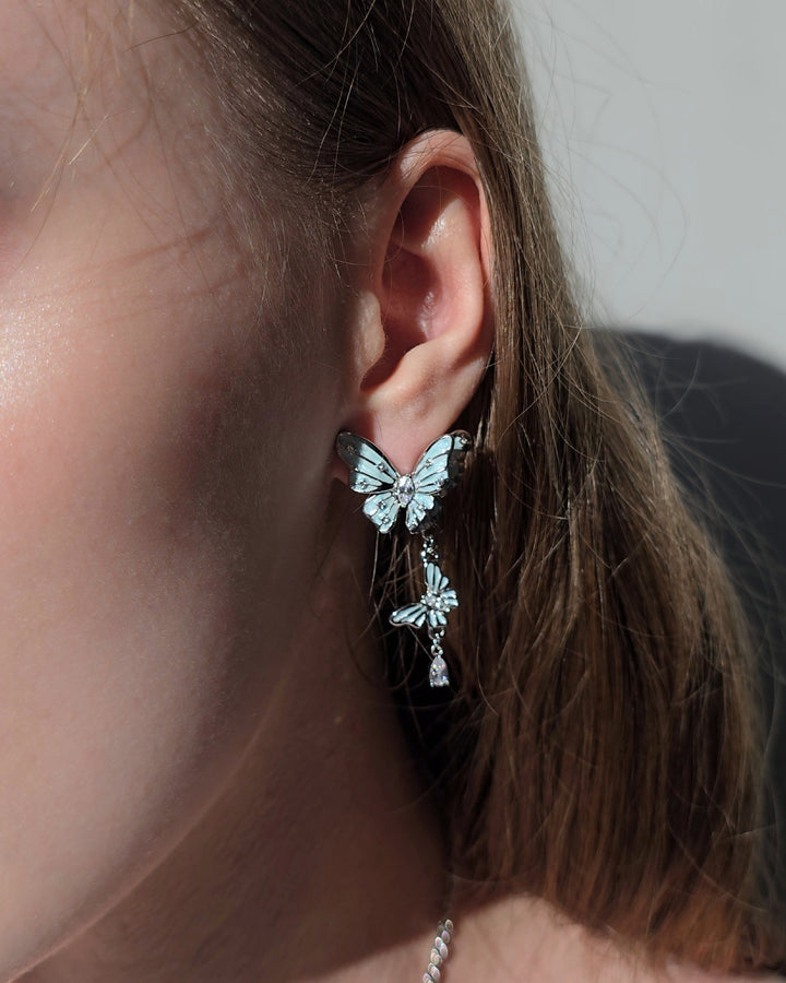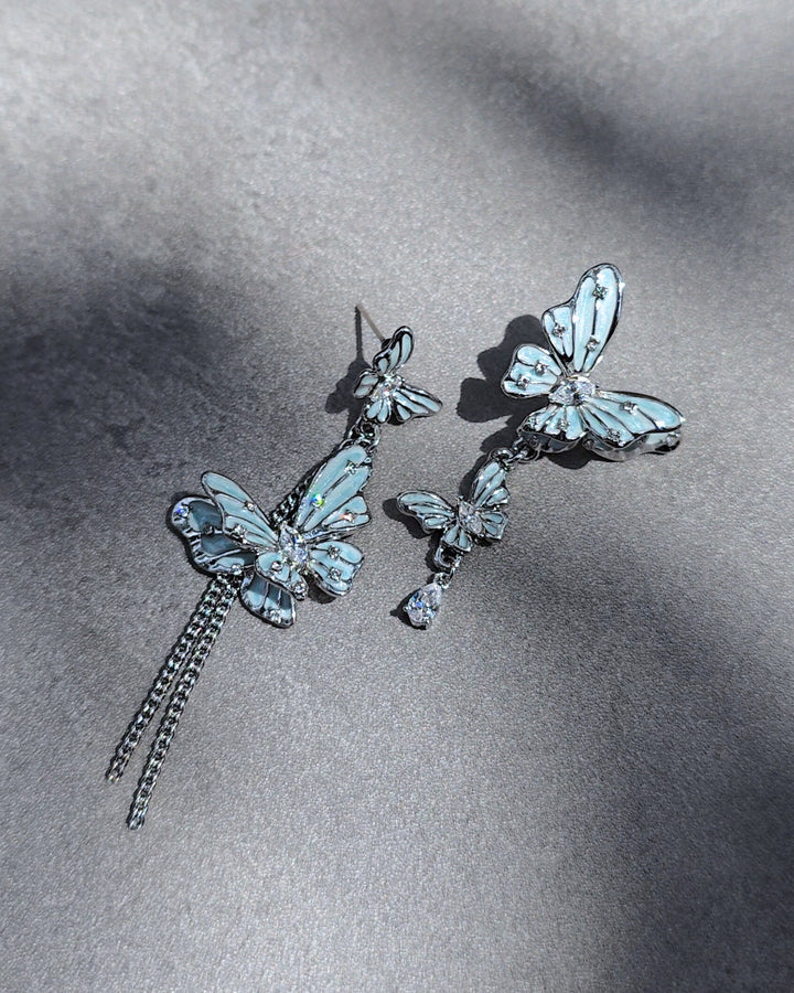 Asymmetrical silver earrings with delicate blue butterflies, accented by gemstones and fine dangling chains. Their wings are sprinkled with tiny crystals that glisten like dewdrops.